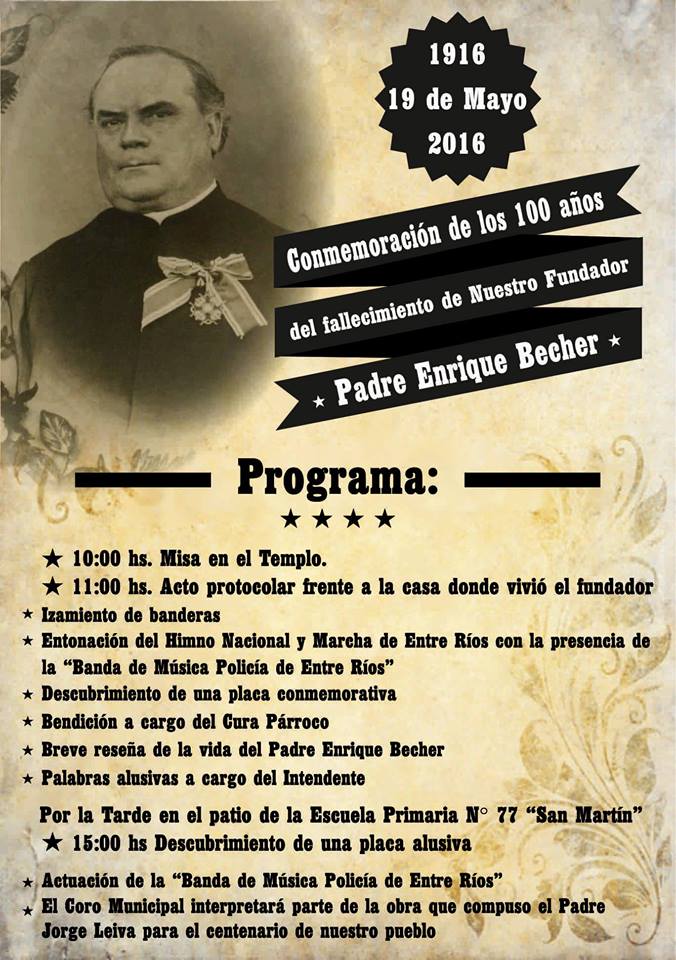 El próximo 19 de mayo, el Municipio junto a todas las instituciones locales (educativas, deportivas, culturales, sociales y religiosas), conmemorarán al fundador de nuestro pueblo, a 100 años de su fallecimiento. Adjuntamos el programa con las actividades de la fecha. |