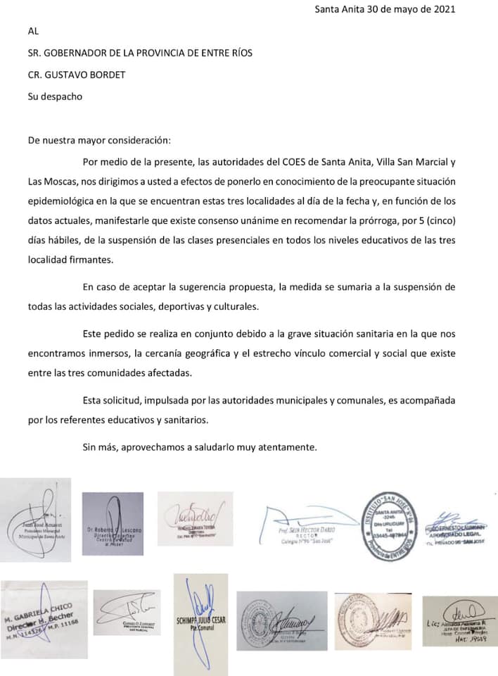 Compartimos el pedido en conjunto enviado esta mañana al Gobierno Provincial por el COES de Santa Anita, San Marcial y Las Moscas, atentos a la grave situación sanitaria que vivimos en la región, con el objetivo de solicitar de manera formal la prorroga por 5 días hábiles de la s... |