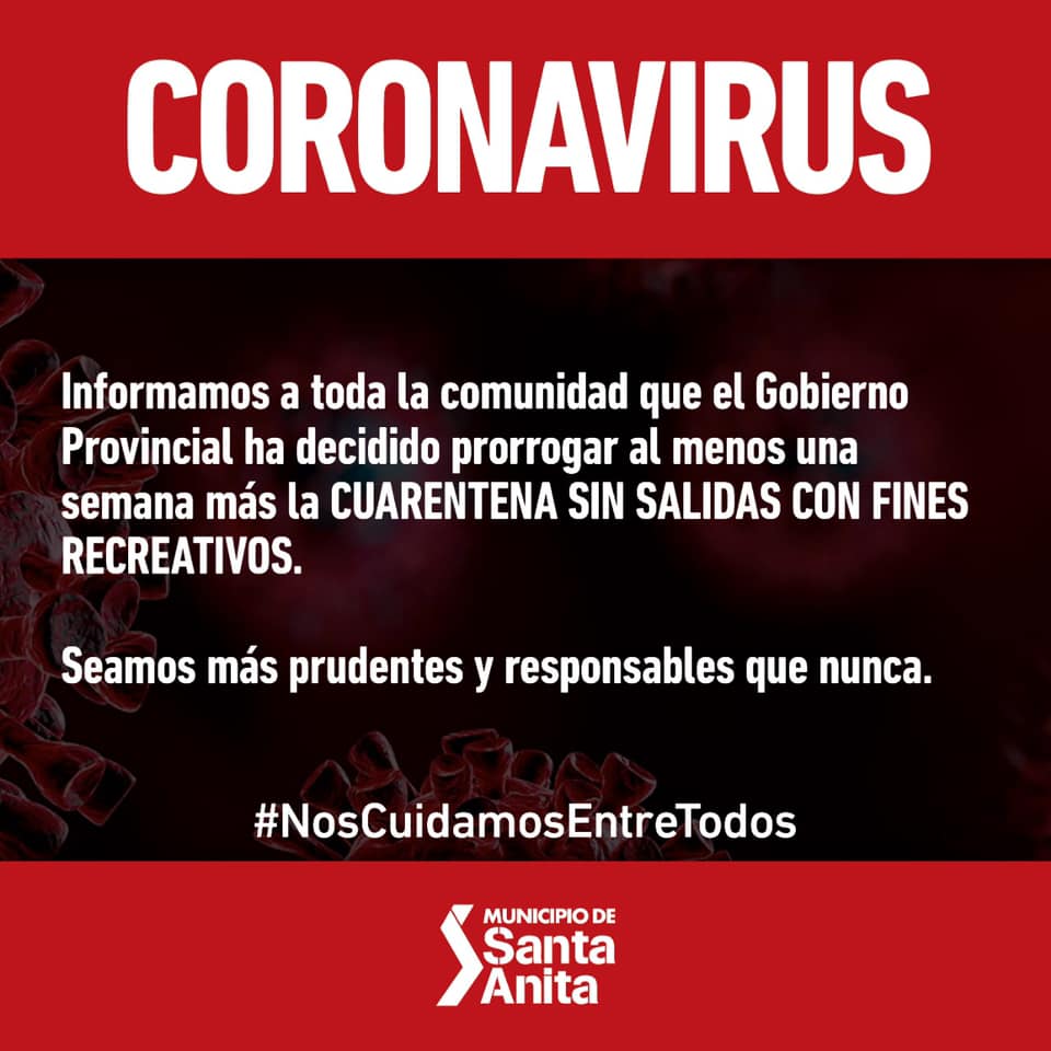 A pesar de que el coronavirus no circula en forma comunitaria en nuestra provincia y no tenemos ningún caso sospechoso en Santa Anita, decidimos incorporar una nueva medida de prevención que, junto al distanciamiento social, el lavado frecuente de manos, el control de ingresos y la ... |