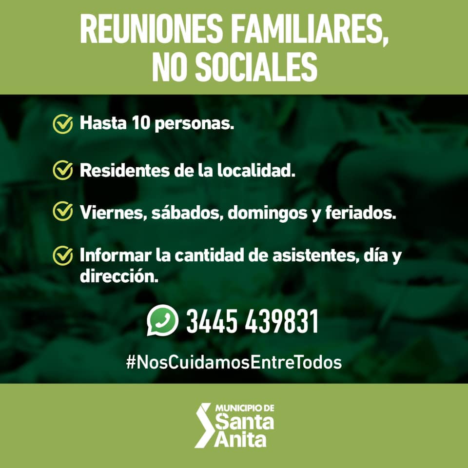 Informamos a todos los vecinos y vecinas de Santa Anita que a partir de este fin de semana se encuentran habilitadas las reuniones familiares en nuestra localidad.