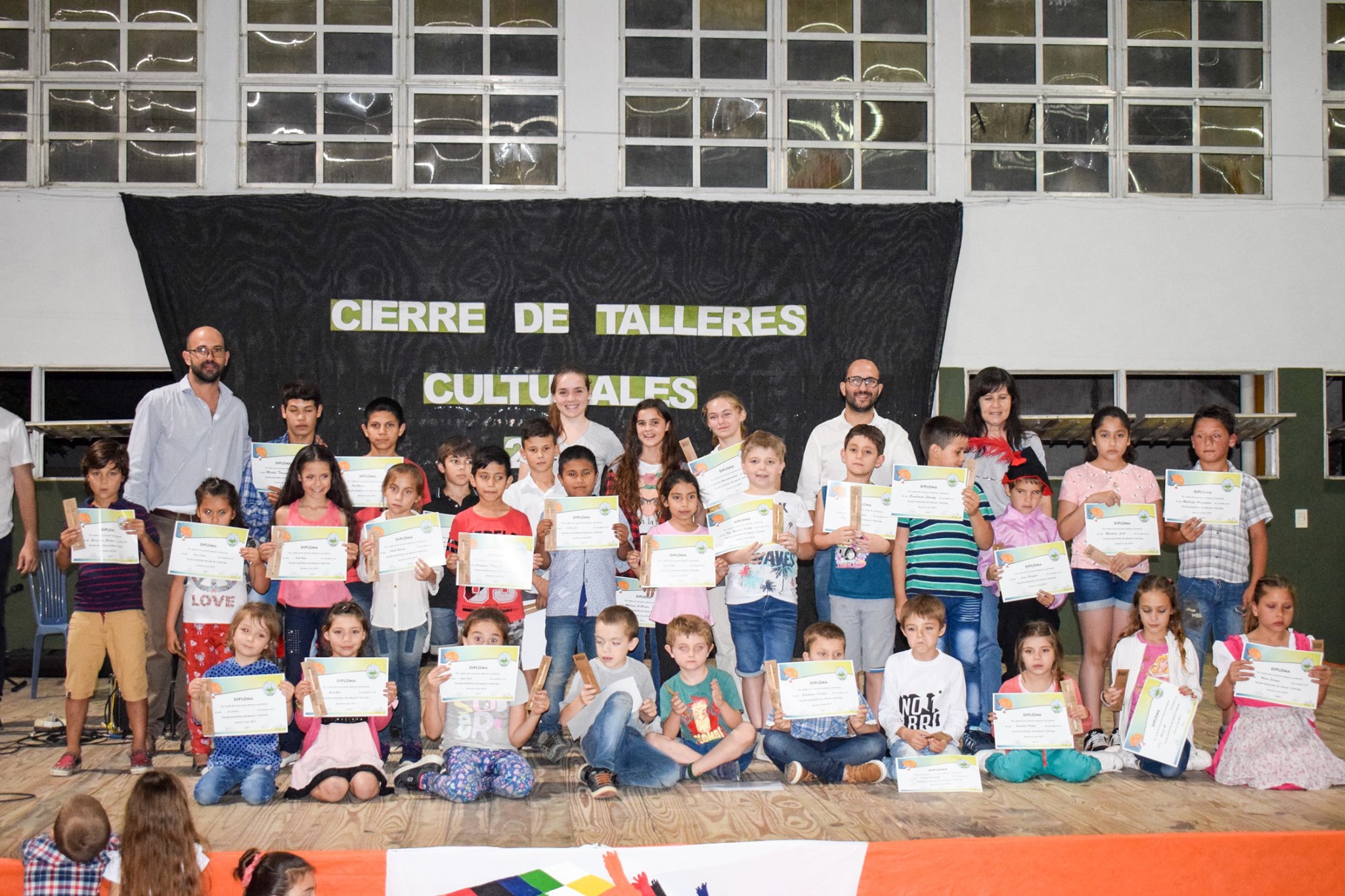 El viernes por la noche se realizó el acto de cierre de los talleres municipales de música, lectura comprensiva y escritura, inclusión e integración social, dibujo y pintura, teatro, folclore, danzas alemanas, coro, porcelana y arte francés, costura, reciclado, telar y cocina.
