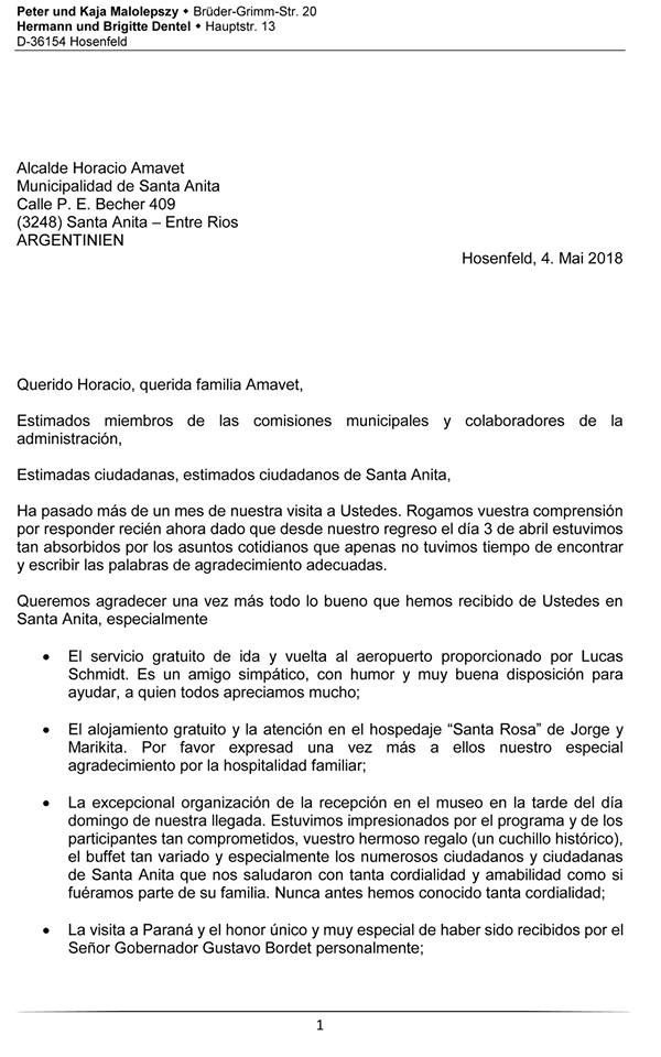 Damos a conocer la carta enviada por el intendente de Hosenfeld y sus acompañantes en relación a su reciente visita a nuestra localidad. Estamos muy contentos que se hayan llevado tan grato recuerdo de Santa Anita y su gente. Seguiremos const... |