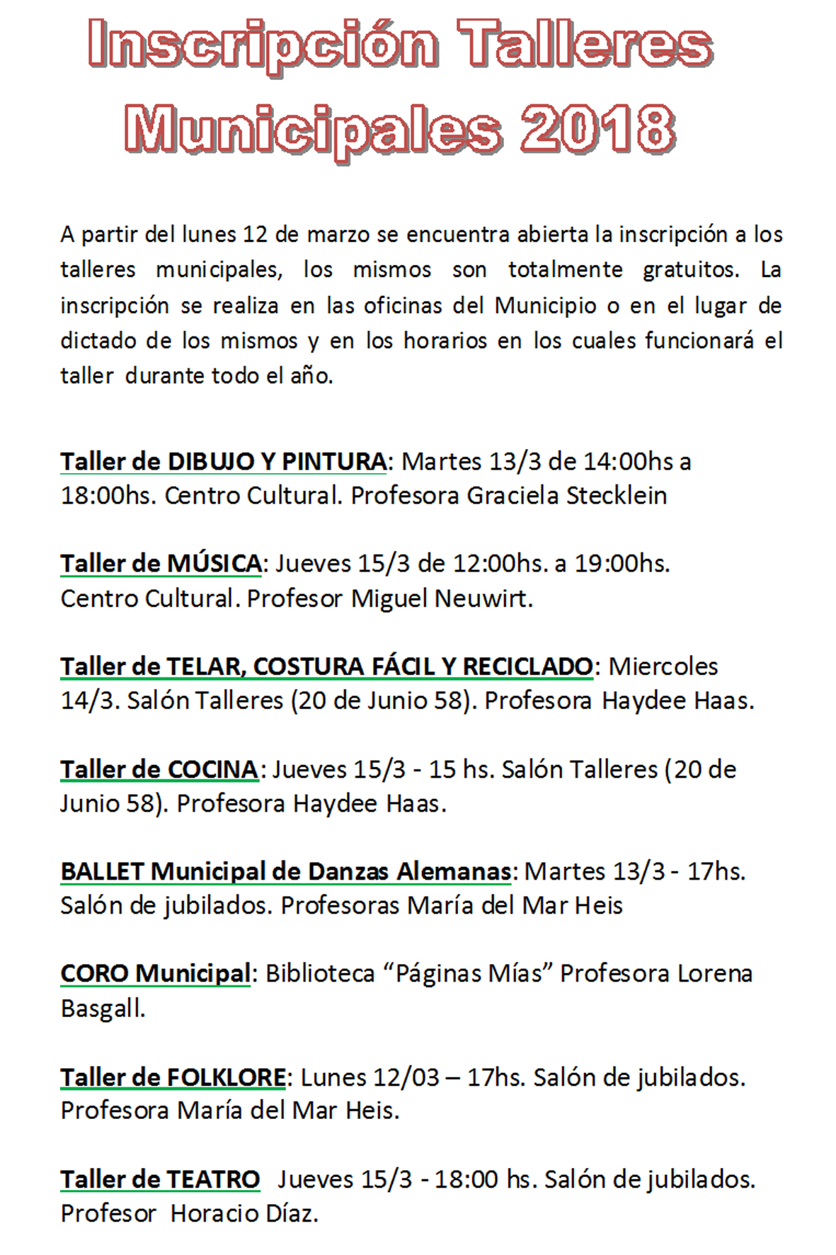 A partir del lunes 12 de marzo se encuentra abierta la inscripción a los talleres municipales, los mismos son totalmente gratuitos. La inscripción se realiza en las oficinas del Municipio o en el lugar de dictado de los mismos y en los horarios en los cuales funcionará e... |