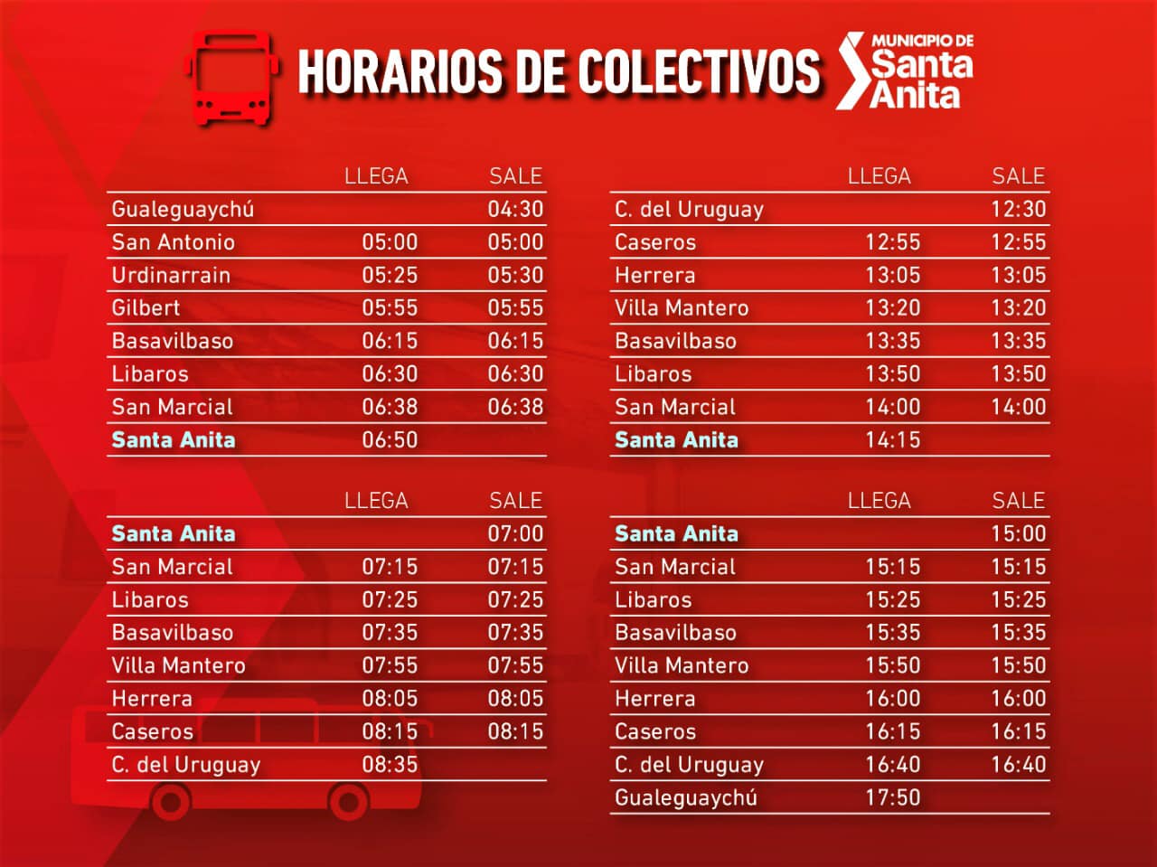 A partir del próximo lunes 25 de abril, por la mañana, el horario de salida desde Santa Anita será a las 7:00 h con regreso desde Concepción del Uruguay a las 12:30 h. Por la tarde, saldrá a las 15:00 h., sin retorno.