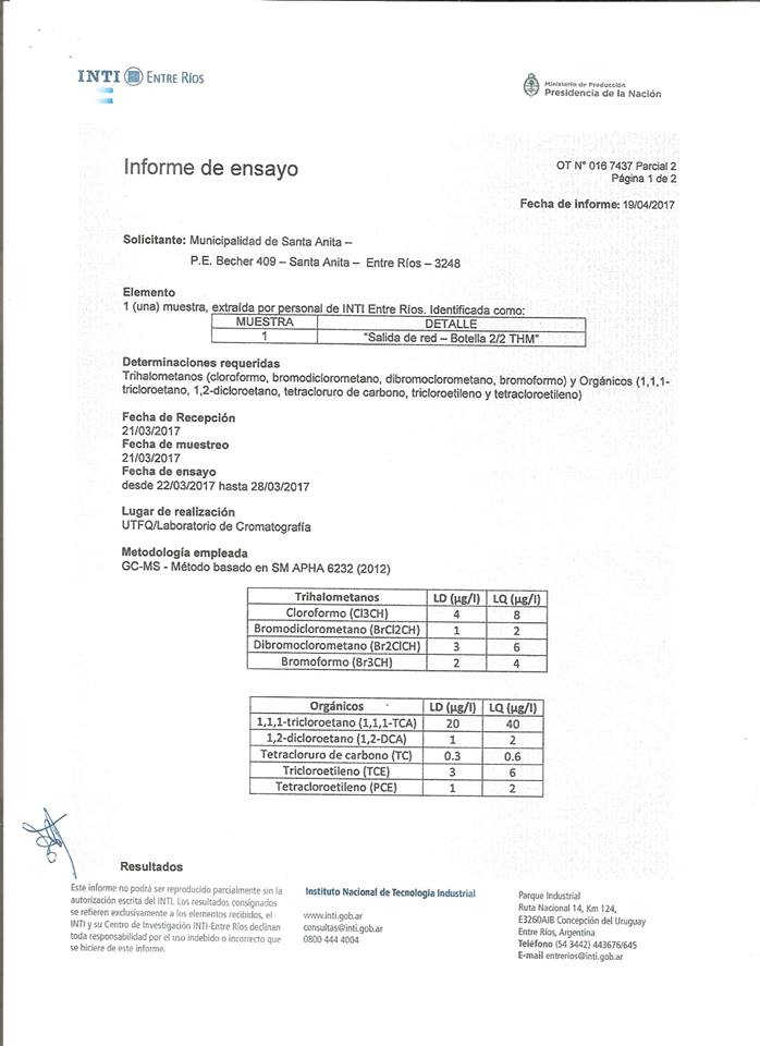 A través del Área de Bromatología y la Cooperativa de Electricidad y Agua Potable, el municipio de Santa Anita le solicitó al Instituto Nacional de Tecnología Industrial (INTI) una serie de análisis del agua que se suministra a los vecinos de la localidad.