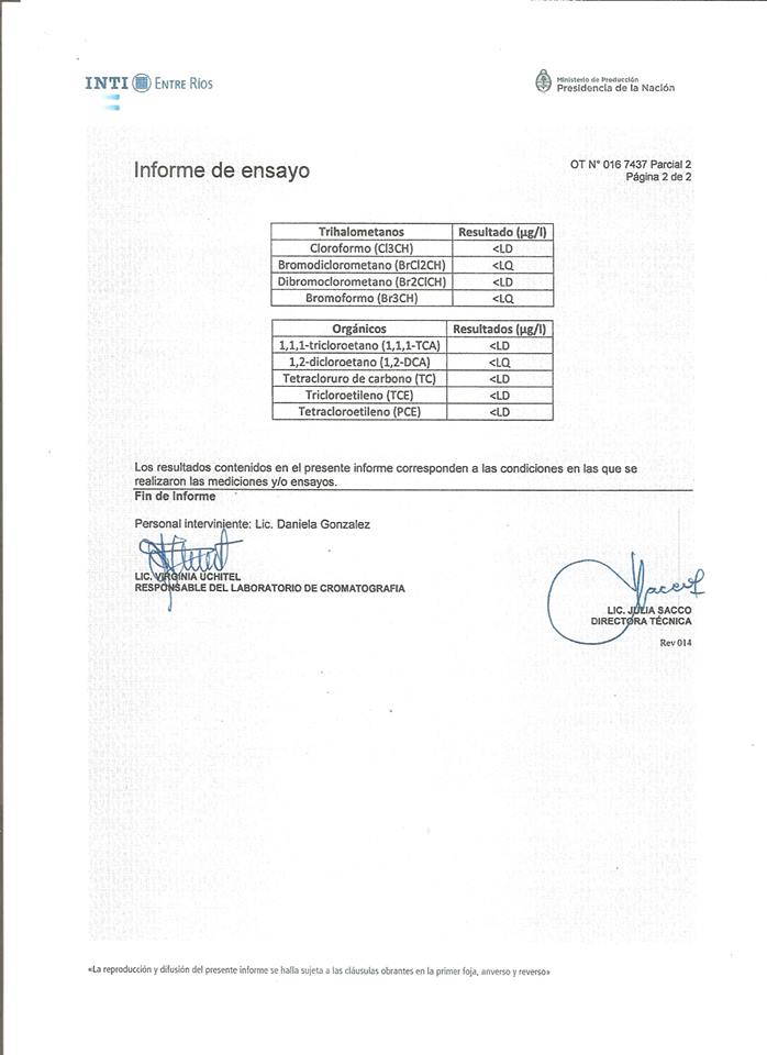 El personal del INTI tomó muestras en la salida del tanque principal y en dos viviendas ubicadas en los extremos del pueblo, a fin de determinar si se están cumpliendo con los estándares en toda la red del servicio. Además de los análisis de rutina que la cooperativa realiza periódicamente, el objetivo fue analizar otros parámetros que la ley no exige pero que son de vital importancia para saber cuál es la calidad del agua en Santa Anita. Para ello, la sede de Concepción del Uruguay del INTI tiene laboratorios de análisis de última generación con certificación a nivel internacional.