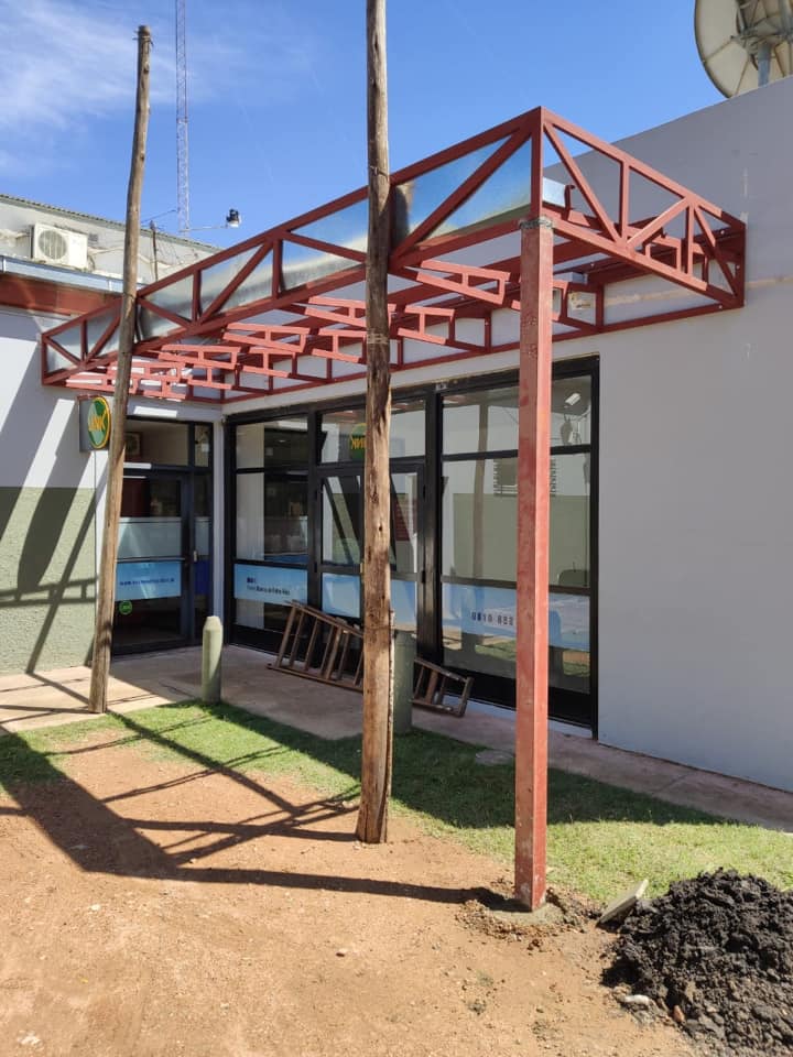 Personal municipal se encuentra colocando un techo frente al cajero como protección para los días de lluvia o de intenso calor.