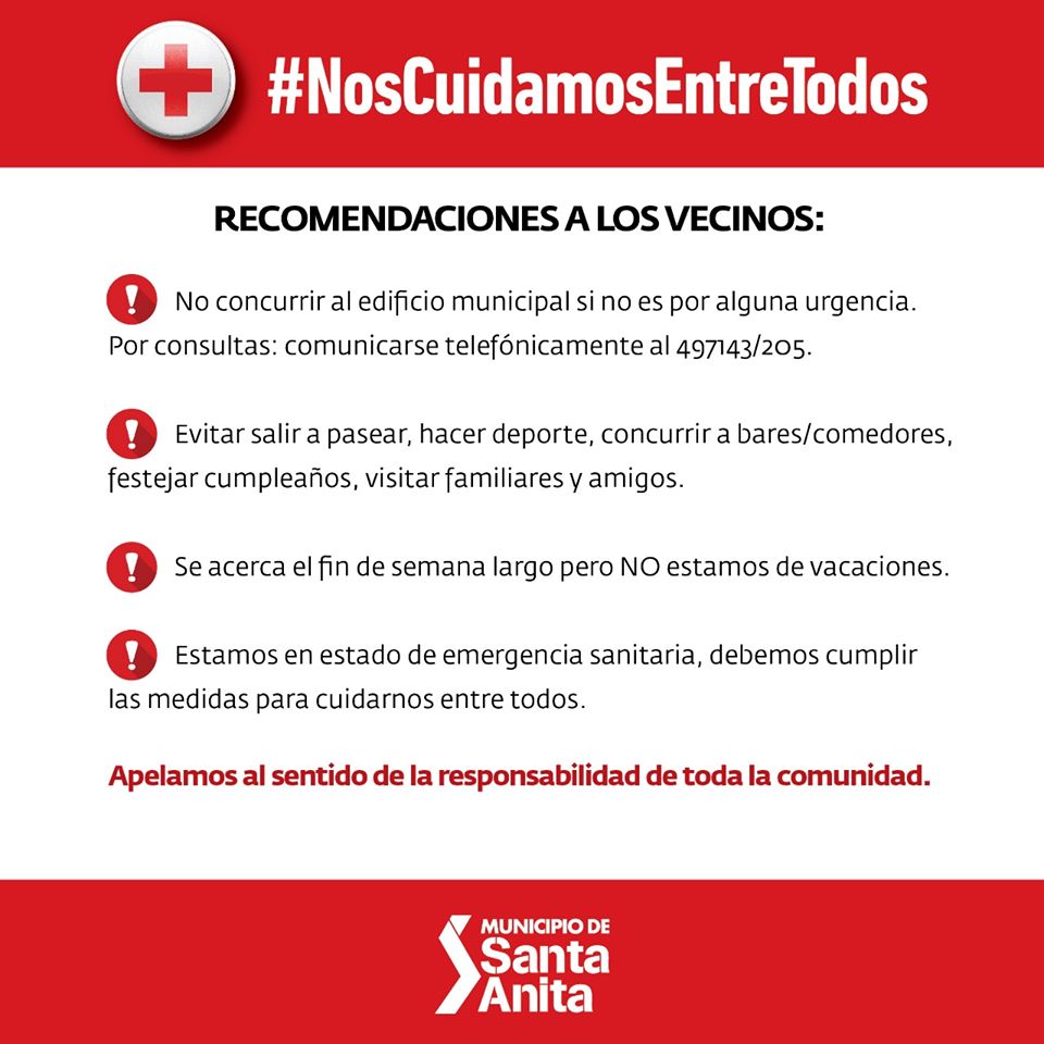 *No concurrir al edificio municipal si no es por alguna urgencia. Por consultas: comunicarse telefónicamente al 497143/205.