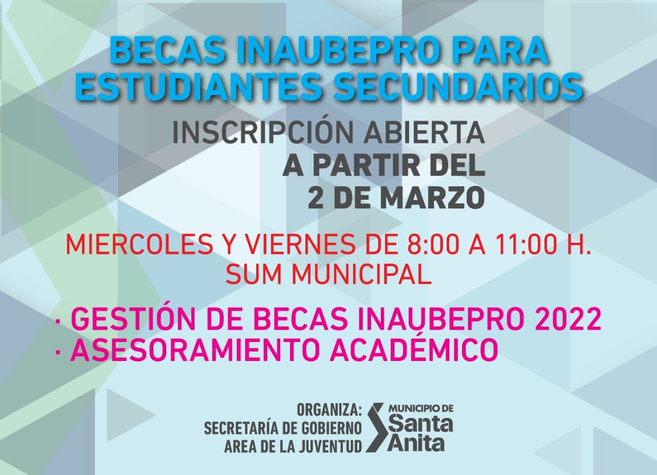 Estudiantes de Santa Anita, les informamos que: a partir del miércoles 02 de marzo, la Secretaría de Gobierno habilitará el Salón de Usos Múltiples Municipal para la gestión de Becas Secundarias del Instituto Autárquico Becario Provincial (INAUBEPRO). Este e... |