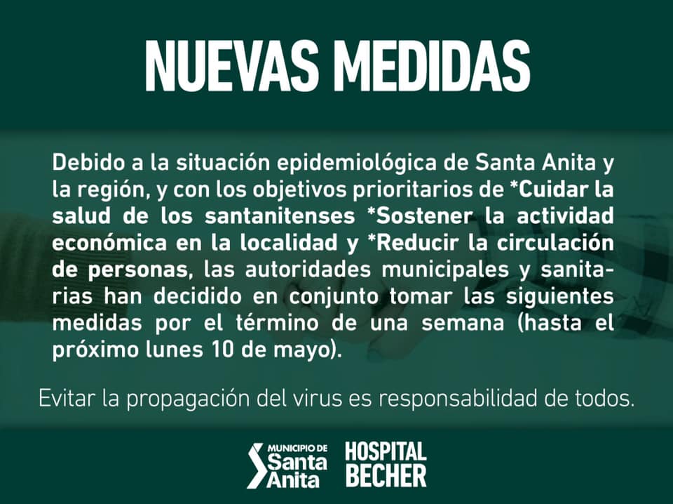 Con el objetivo de *Cuidar la salud de los santanitenses *Sostener la actividad económica en la localidad y *Reducir la circulación de personas, las autoridades municipales y sanitarias han decidido en conjunto tomar algunas medidas de carácter restrictivo por el término de una sema... |