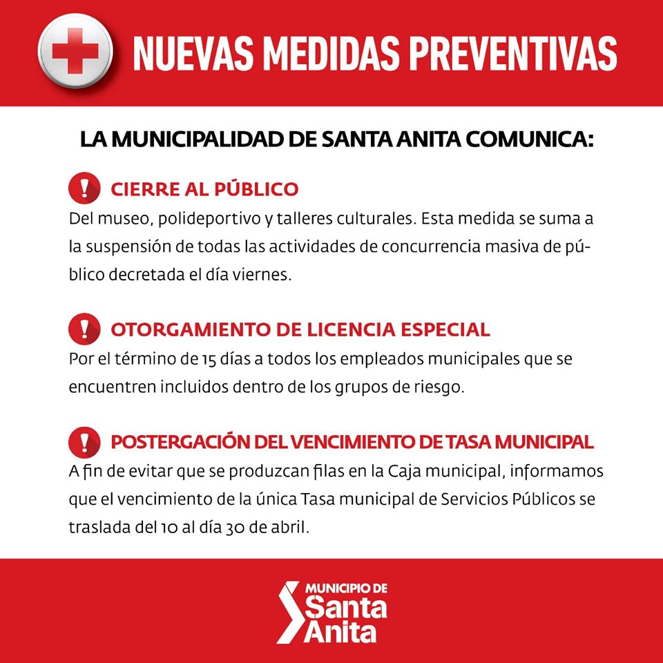 La Municipalidad de Santa Anita adhiere al Decreto Provincial 361/20 y, por lo tanto, se declara el estado de emergencia sanitaria en el ámbito de la jurisdicción de Santa Anita.